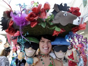my favorite ice skaters, Bitch and Please.Johnny Weir, dont ever change.subtle, probably put together by mice and bird friends.put a bird on it: maybe this bird helped build the hat above.the best horse-flower-wreath hat of the day.perfectly springy, suble, almost life-like. and i want one.her name was Lola, she was a showgirl – with yellow feathers in her hair and she will never be able to hold her head straight again.funny story, she was making a wreath and it just got out of hand.she knows it’s not a pig race, right?just say no to pastel bushes on your head.all hats should required to have a Barbie and/or horse on them. preferably both.i onow it doesnt look like me, but it is. in my Talk Derby To Me hat.let’s go to the men. we will prbably regret this. at least this one.now we know what Santa does in May.Fred didn’t trust his gps. he preferred to map out directions to the Derby in diorama form. on his head.horse on it, check. “official drink of the kentucky derby” button, check. miniature bottle, check. flowers, check. stovetop pipe, check. but I feel like its missing something.wrong occasion. go home.bonus points if it’s battery operated.and we have the winner, by a nose!