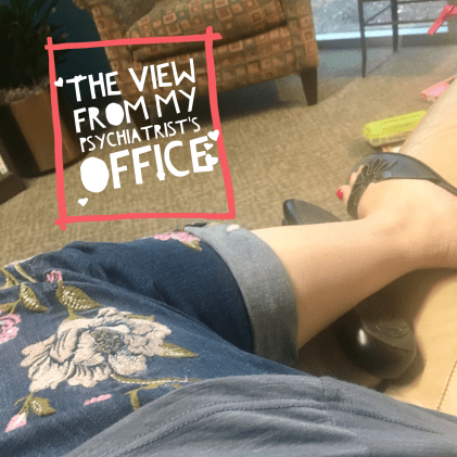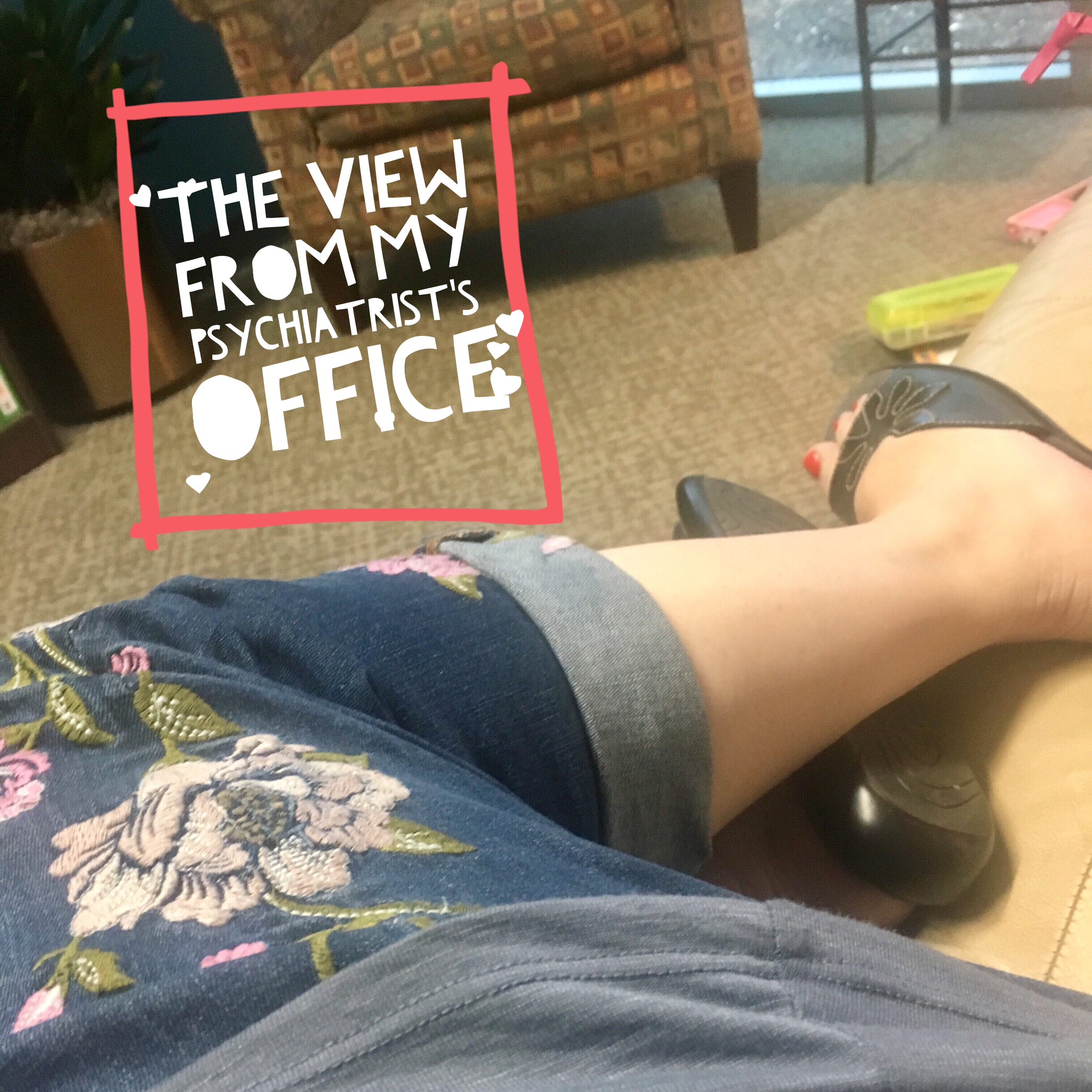 On Friday I went back to my psychiatrist. That’s me in the photo and that’s how I usually sit. Yes, it’s a sofa, but as often portrayed in comic strips, one doesn’t lie down in the psychiatrist’s office. It’s a relatively short visit. It isn’t therapy, it’s to identify illness and treat it. So, I come in, drop my purse on the sofa and plop down with my feet up ā always. I don’t know why. That’s how I sit at home and I’m pretty at home with my psychiatrist since I’ve been seeing him for three years. This time was a little different. He asked me how I was doing as he always does, but this time we went over the visit from last month. I told him I was in a completely different place and confessed that I was convinced he was going to have me admitted to the hospital before. He told me he thought about it, but thought it would make me worse in the short term. Then he said “man, you were bumming ME out.” I laughed. If you have a psychiatrist and he/she doesn’t have a sense of humor then you need to get a new one; but you can’t have mine. Then he read some of the things I said. I wanted to use the When Harry Met Sally quote, “no one’s ever quoted Me back to Me before!” but I didn’t. It was surreal. The person he was quoting wasn’t me. I didn’t recognize that person.