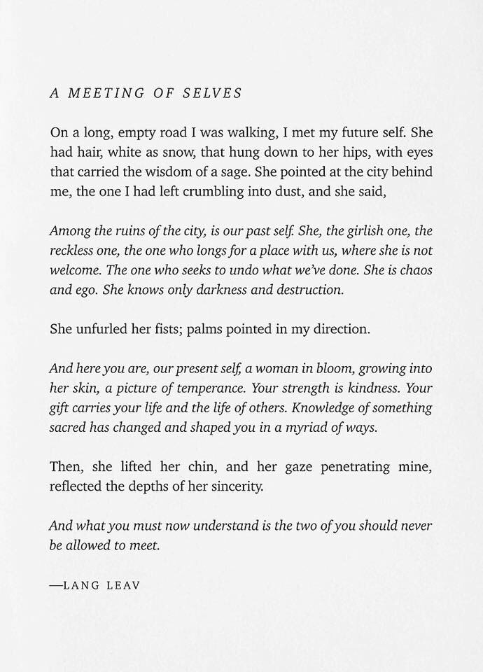 97/365: A Meeting of Selves Kerry Faler Uncategorized April 2, 2018 1 Minute As, I’ve said before, I love poet Lang Leav. This might be my favorite. It is where I am. Share this: Share on X (Opens in new window) X Share on Facebook (Opens in new window) Facebook Like Loading... Published by Kerry Faler I collect typewriters in the 21st century. I’m an enigma that way. View all posts by Kerry Faler Published April 2, 2018