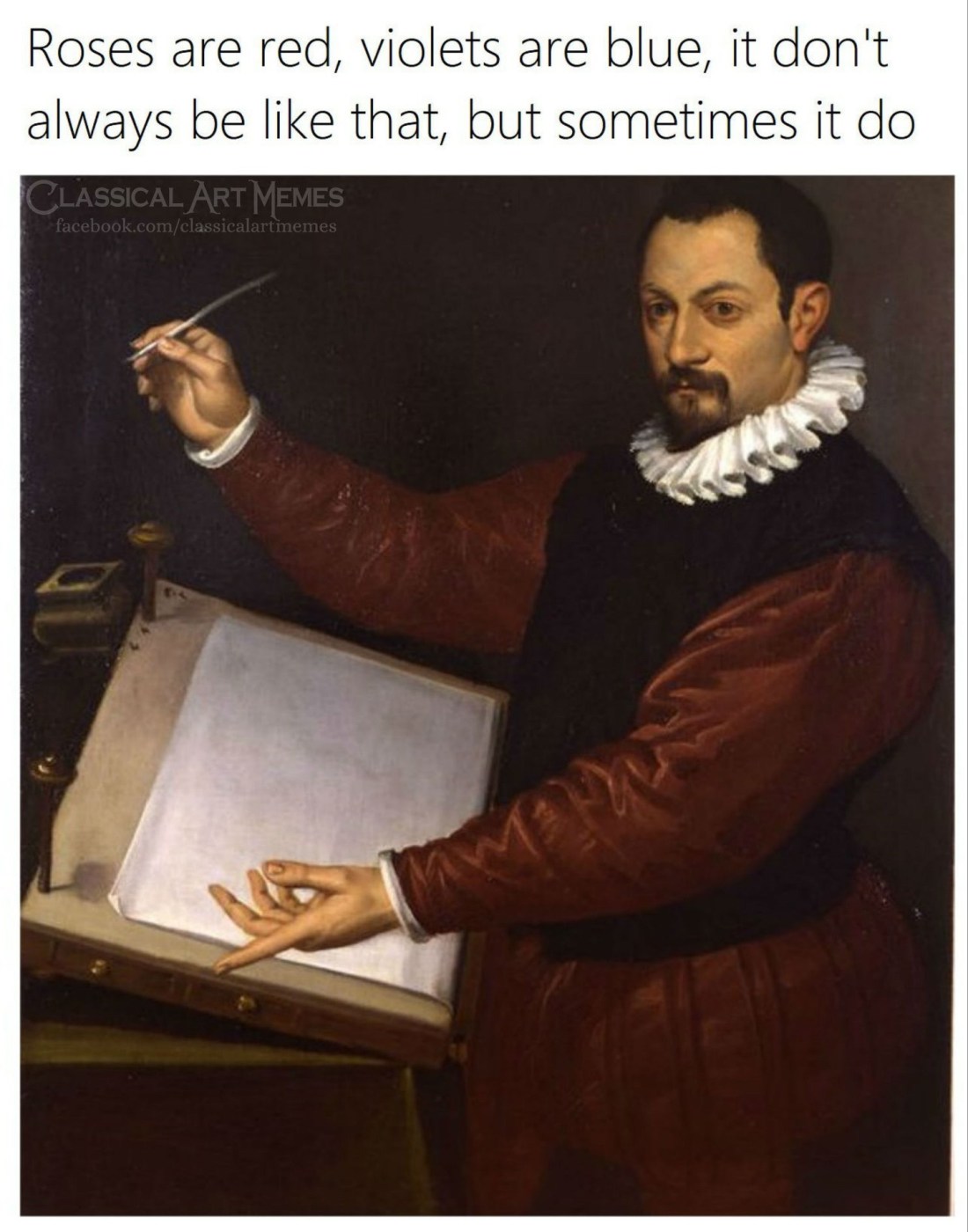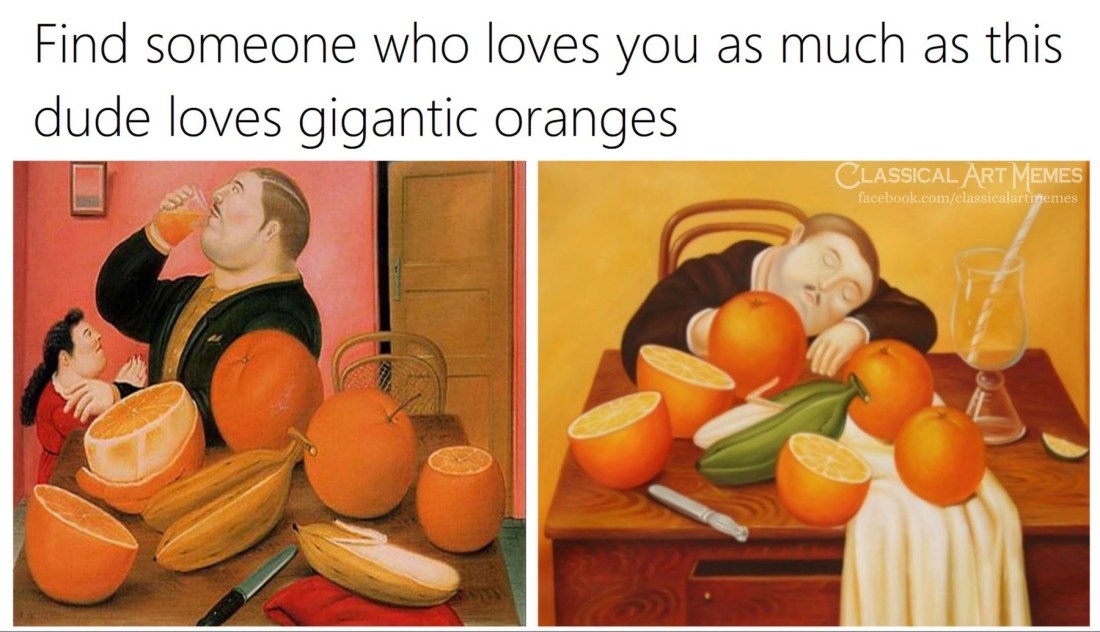 3.69/365: classical art memes Kerry Faler Uncategorized March 10, 2019 1 Minute I follow Classical Art Memes on The Facebook and you should too. This is why: Share this: Share on X (Opens in new window) X Share on Facebook (Opens in new window) Facebook Like Loading... Published by Kerry Faler I collect typewriters in the 21st century. I’m an enigma that way. View all posts by Kerry Faler Published March 10, 2019