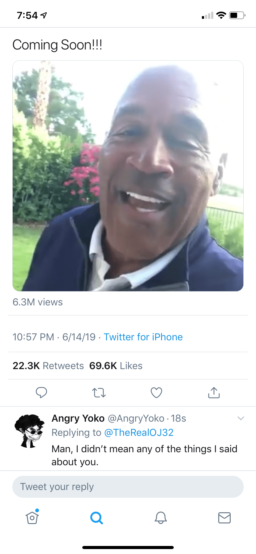 O.J. Simpson joined Twitter and today tweets “I got a little gettin’ even to do” — his first tweet. I’ve said a lot of shit about him over the years, then not inviting him to our birthday luncheons, so I replied — just to be safe.