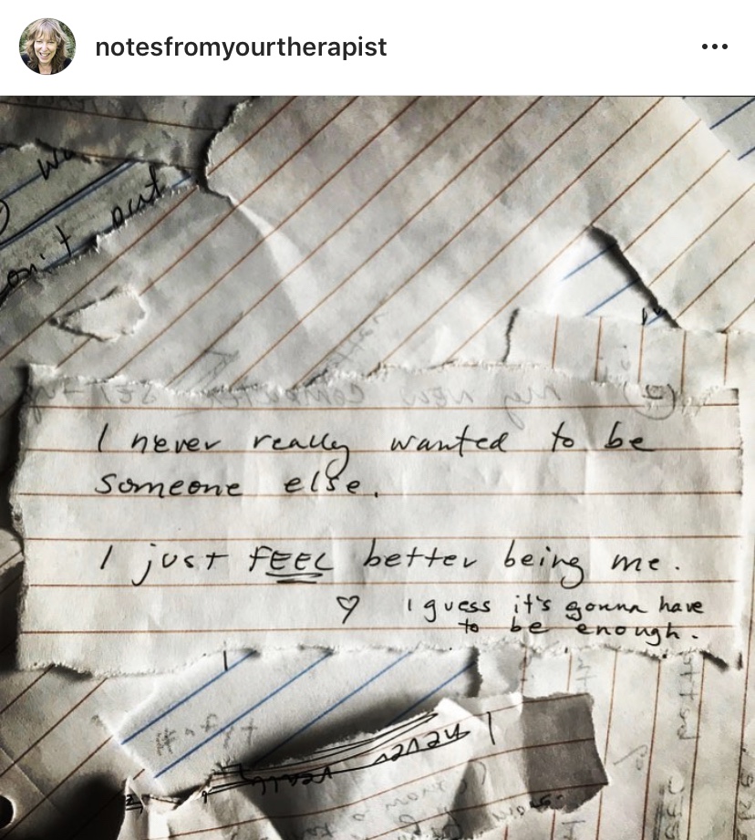Unlike this Notes From Your Therapist post, I did want to be someone else at times. Sometimes long stretches. But I am authentically me now. At 45. I have been for a couple of years. Being who you are can be hard because you have to address things that may be buried deep. Digging is worth it.
