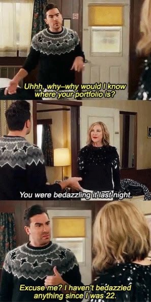 My favorite comedy of late, Schitt’s Creek, is coming to a close with its 6th season soon, and so, I thought I’d share a few of my favorite moments. The show is about an extremely wealthy Hollywood family who loses all of their money and move into a motel in a town they own in the middle of nowhere, Schitt’s Creek.