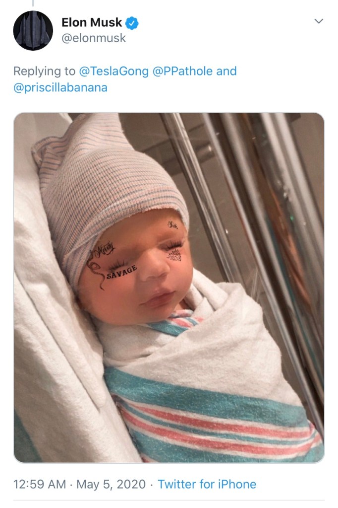 This is the explanation of little X Æ A-12’s name from his mother, Grimes. And Musk’s photo of his seventh child with a face tattoo — you know, like you do.