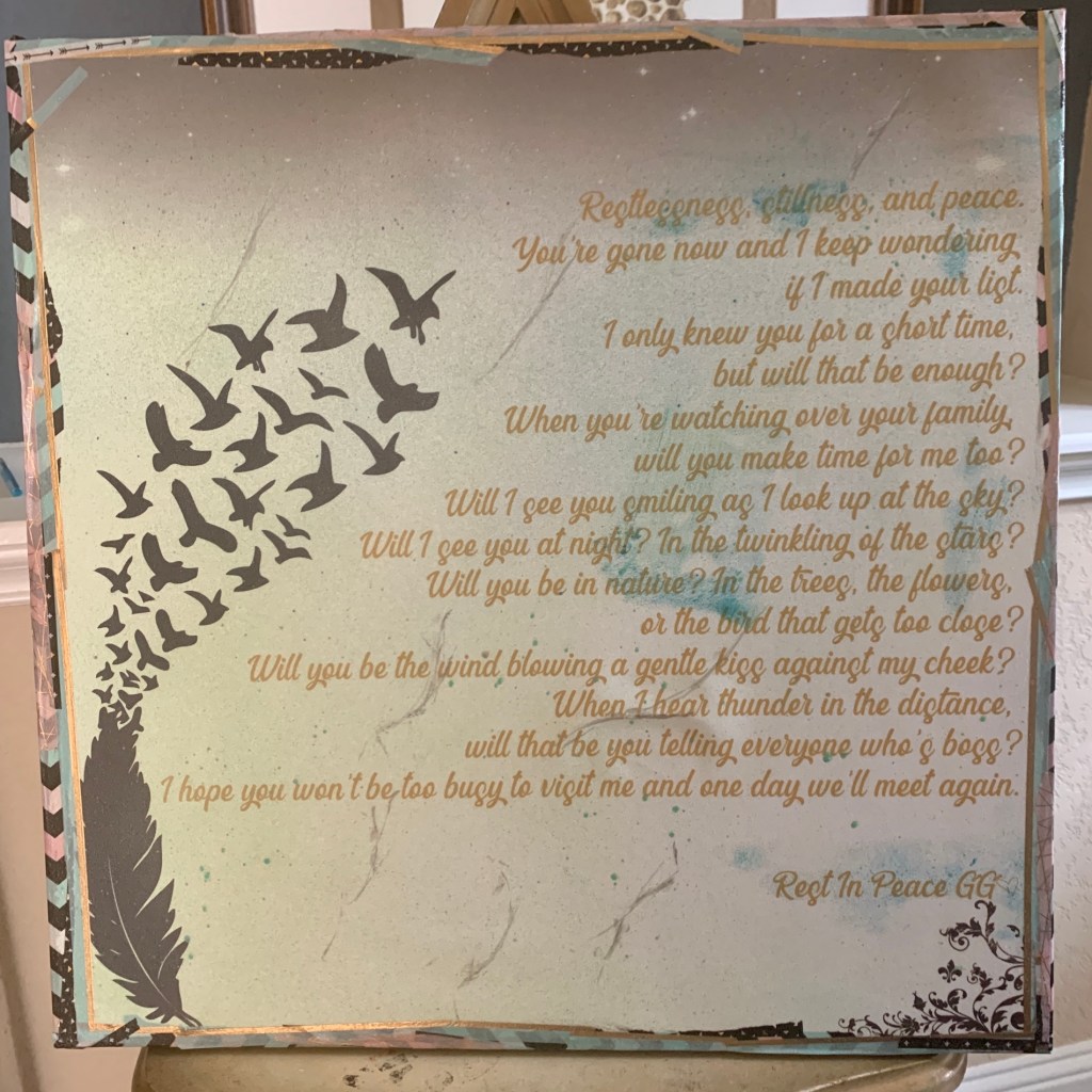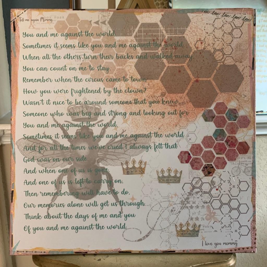 A sweet friend asked me to make two pieces of art for her in memory of her mother and enjoyed the process so much. I’ve been making mixed media art with song lyrics styled in typography and add paint, alcohol ink, washi tape, metal sizing, fibers, and cut shapes. My friend requested a Helen Reddy song and a poem her friend wrote. She sent me pics of things from her bedroom to get an idea for colors and asked me to incorporate things her mom liked: birds, feathers, bees, and crowns.