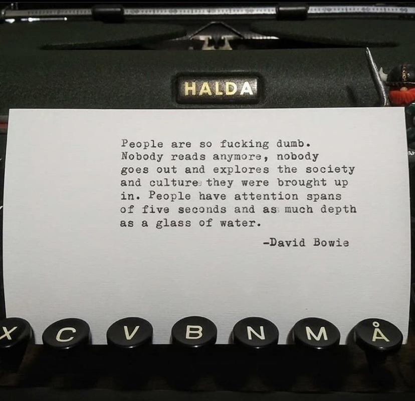 3.206/366: David Bowie on depth Kerry Faler Uncategorized July 24, 2020 1 Minute Share this: Share on X (Opens in new window) X Share on Facebook (Opens in new window) Facebook Like Loading... Published by Kerry Faler I collect typewriters in the 21st century. I’m an enigma that way. View all posts by Kerry Faler Published July 24, 2020