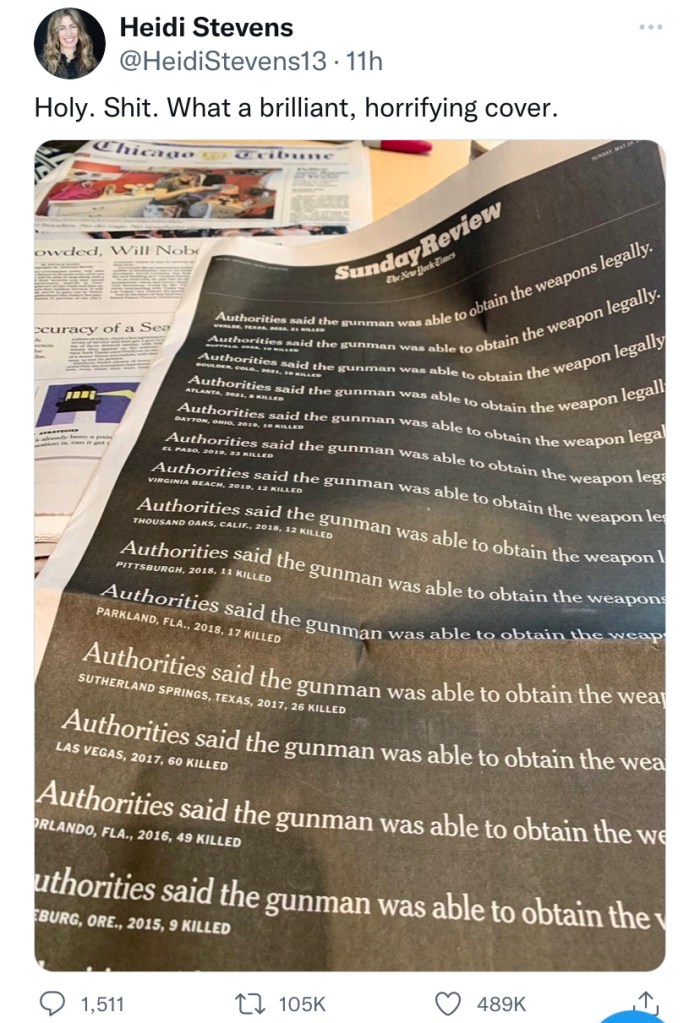 “Authorities said the gunman was able to obtain the weapon legally” with the dates of over a dozen mass shootings. So, the “but criminals will always be able to get guns” argument when we talk about gun reform is moot.