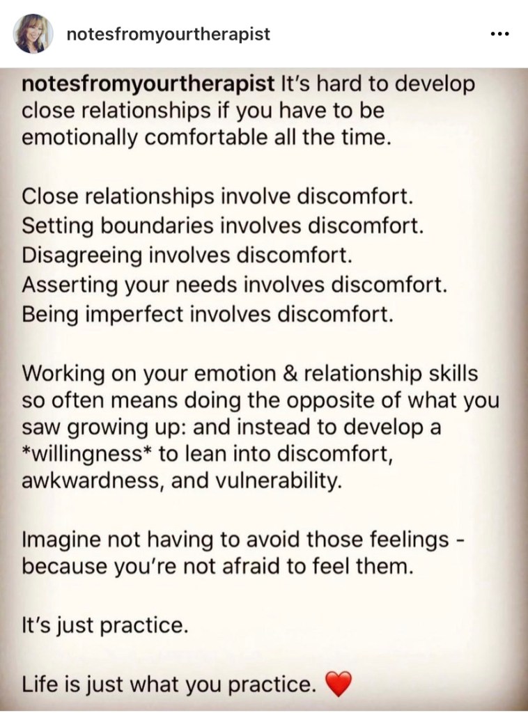 5.193/365: notes from your therapist no. 50 Kerry Faler Uncategorized July 12, 2022July 14, 2022 1 Minute Fact: being uncomfortable will not kill you. Share this: Click to share on X (Opens in new window) X Click to share on Facebook (Opens in new window) Facebook Like Loading... Published by Kerry Faler I collect typewriters in the 21st century. I’m an enigma that way. View all posts by Kerry Faler Published July 12, 2022July 14, 2022