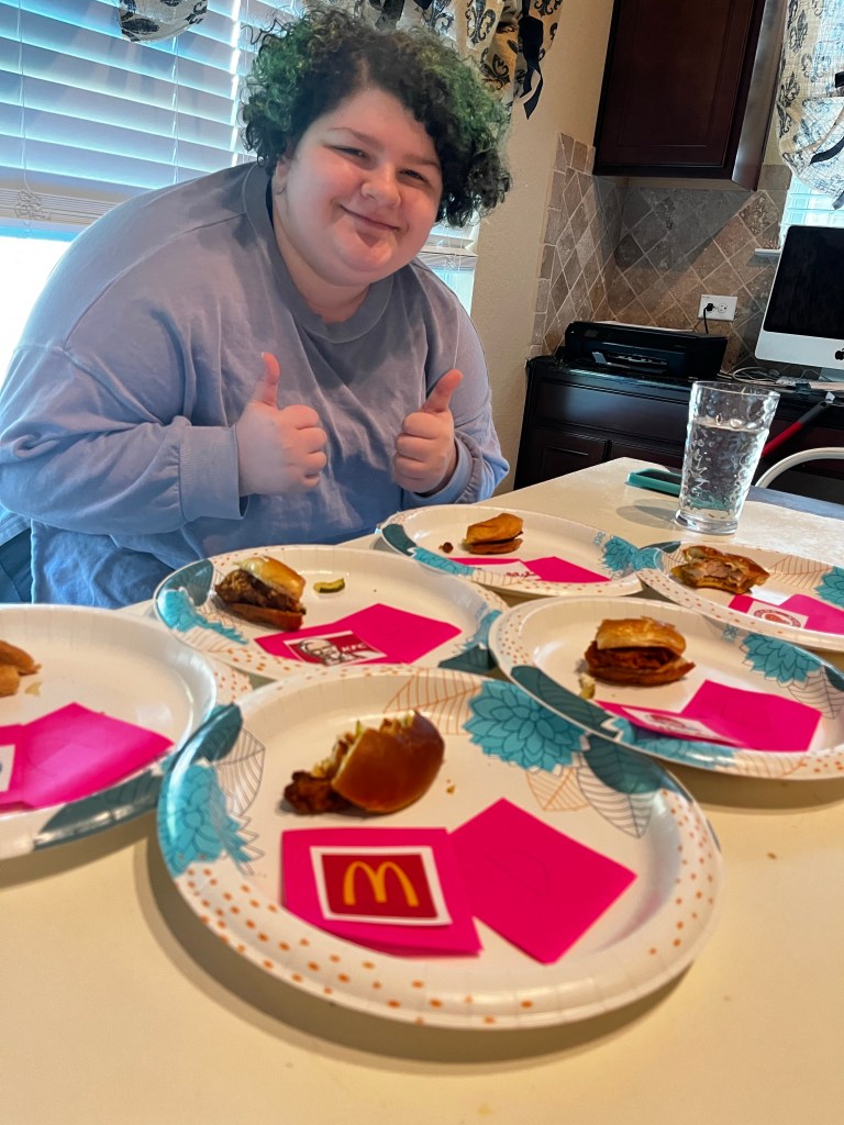 Katie is leaving Friday for college and I wanted to do a surprise something. So, inspired by Good Mythical Morning (a YouTube Show we watch together), we held the Match Your Finger Lickin’ Taste Buds to the Sandwich Taste Challenge. She loves chicken sandwiches and has a ranking of all the popular chains. I cut them in quarters and the rest are for dinner.