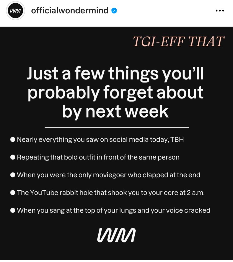 My new favorite Instagram account is Wondermind. Wondermind is a mental fitness company co-founded by Selena Gomez. They have a fantastic IG, a M/W/F newsletter, and they’re starting a podcast. It’s all very positive without being GOOPY and recognizes that depression and other mental illnesses are real. And their posts and newsletters are written the way my friends and I talk! I just love it.