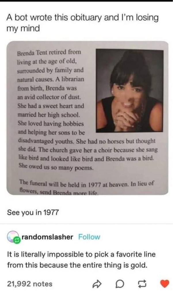 “A librarian from birth, Brenda was an avid collector of dust.”