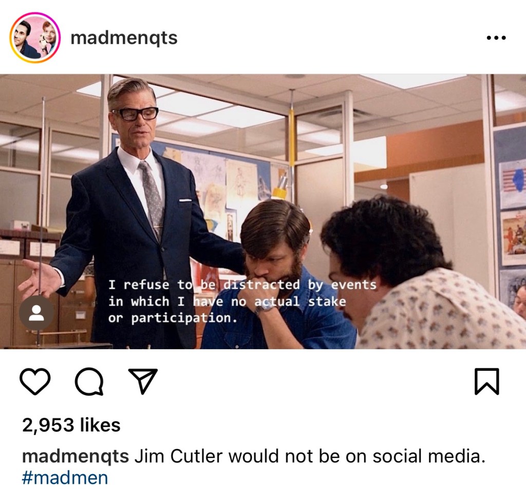 5.277/365: me too, Jim Kerry Faler Uncategorized October 5, 2022 1 Minute Jim Cutler wasn’t on Mad Men for all that long, but he had a few pearls. Share this: Click to share on X (Opens in new window) X Click to share on Facebook (Opens in new window) Facebook Like Loading... Published by Kerry Faler I collect typewriters in the 21st century. I’m an enigma that way. View all posts by Kerry Faler Published October 5, 2022