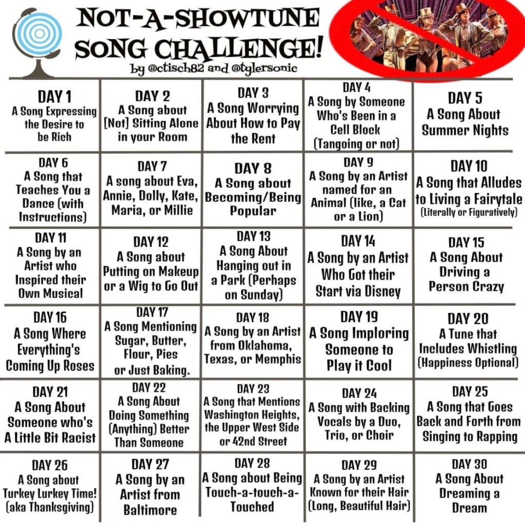 Professor Doctor Hillary and I have decided to bring back the gold old blog challenge. This is a song one. Its the Not a Showtune Sobg Challenge. I don’t think this will be a hard one.