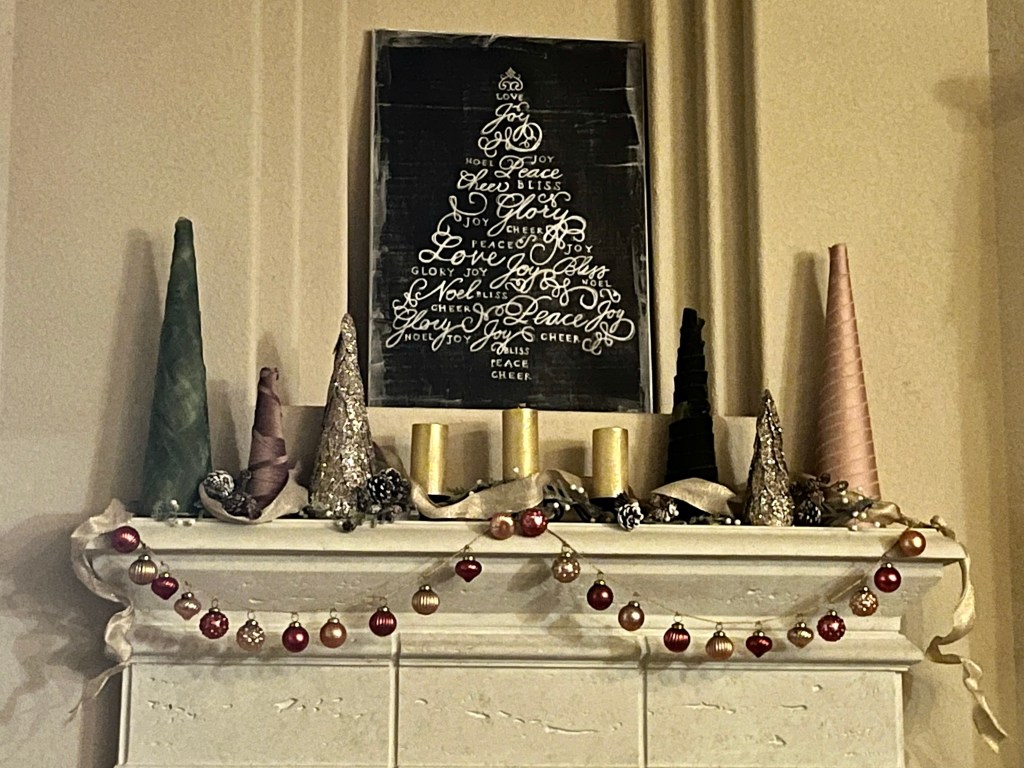 So, I don’t have a snowy scene or icicles, but I do have a mantel that is entirely new this year. The sequined trees were purchased, the ribbon trees were made by me, and the garlands are from Amazon. I’m exceptionally pleased with the colors and the mercury glass ornaments.