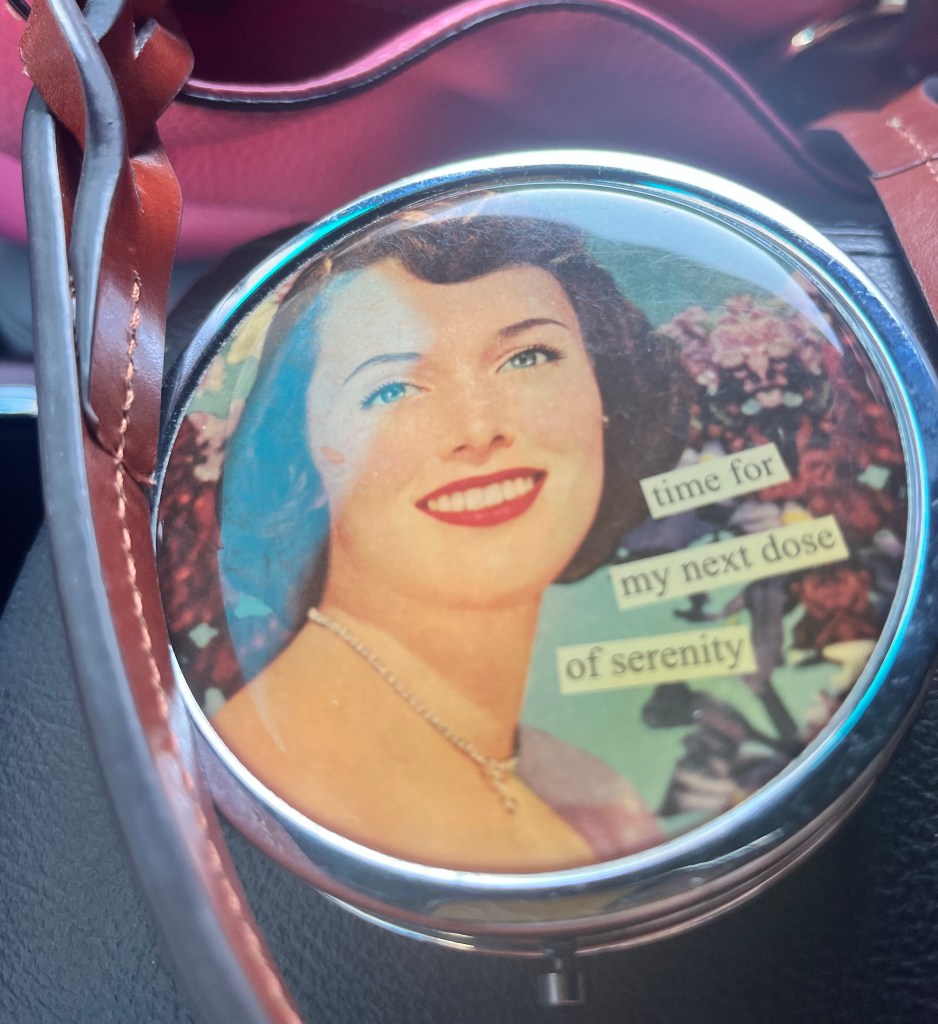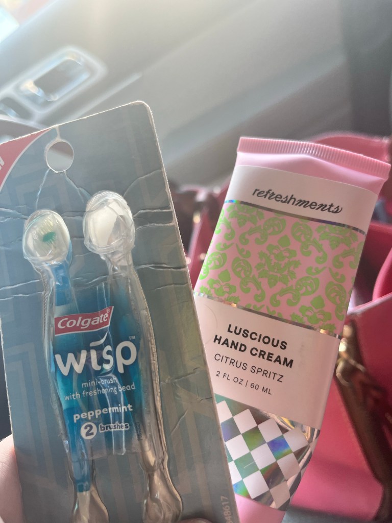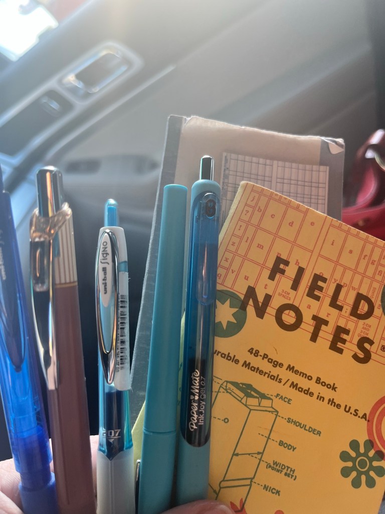 Cute, lots of pockets. Top viewField Notes notebook, checkbook, assorted pensWisp disposable toothbrushes, hand lotionAcetaminophen and allergy medicine Lipstick, shine blotter, powderCoach wallet I’ve had for 15 years and change purse that came with this pursePill can’t for stuff