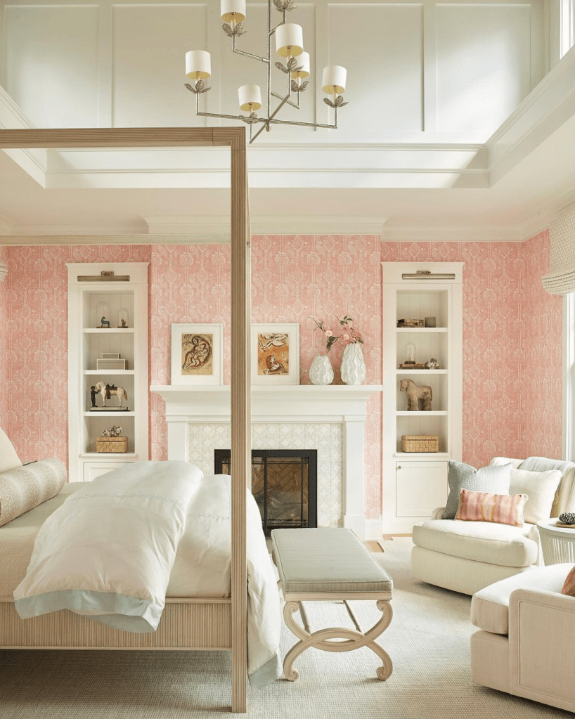 With a few adjustments, this is my dream bedroom. I love pink. I love fun wallpaper, books, and a mantle. I would change out the bed for an upholstered headboard or another fun headboard. And the light fixture has to go. Give me a fan.