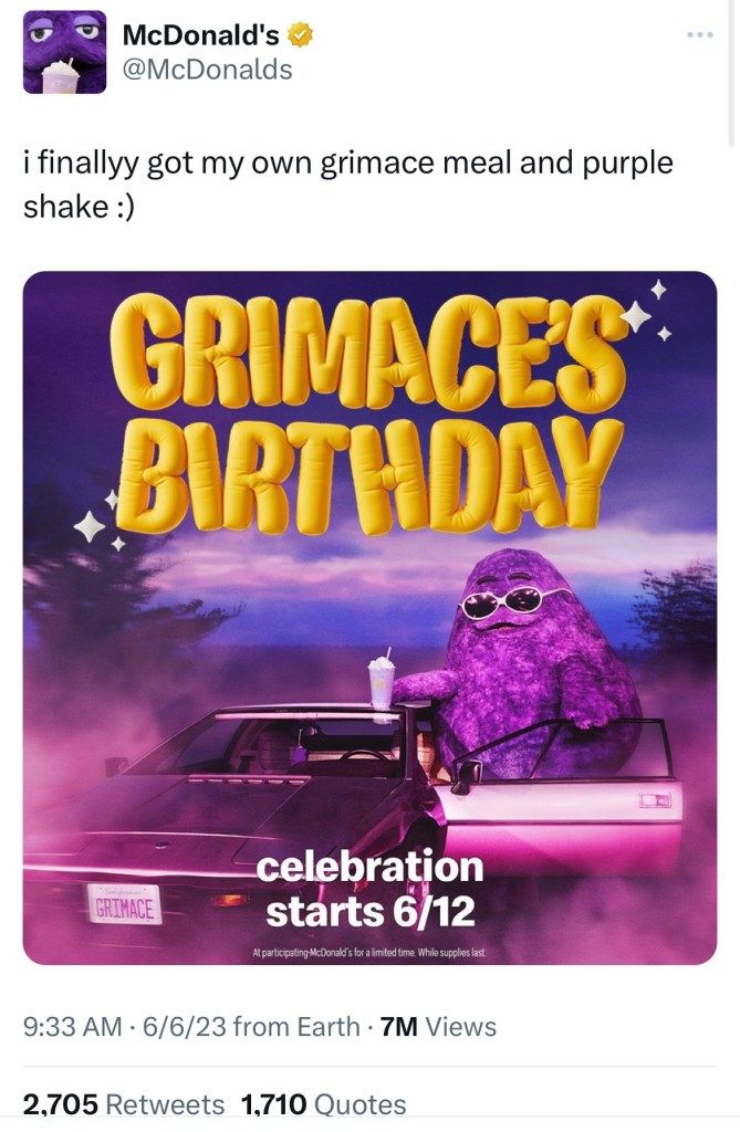 McDonald’s is celebrating their purple character, Grimace’s 52nd birthday this year — they skipped the 50th, which would have been a milestone to celebrate.