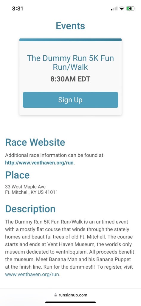 6.177/365: dummy run Kerry Faler Uncategorized June 27, 2023 1 Minute Professor Doctor Hiljary asked me if I wanted to do this 5K. Run with ventriloquists’ dummies. That would be a no. Share this: Click to share on X (Opens in new window) X Click to share on Facebook (Opens in new window) Facebook Like Loading... Published by Kerry Faler I collect typewriters in the 21st century. I’m an enigma that way. View all posts by Kerry Faler Published June 27, 2023