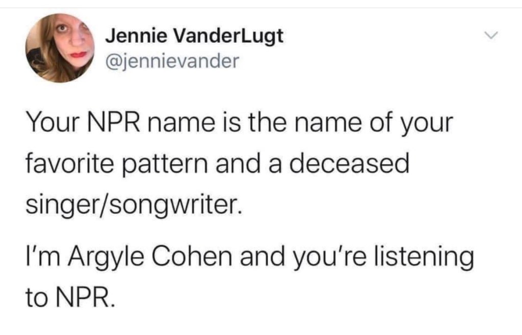 6.246/365: NPR name Kerry Faler Uncategorized September 2, 2023 1 Minute I’m Gingham McVie and you’re listening to NPR. Share this: Click to share on X (Opens in new window) X Click to share on Facebook (Opens in new window) Facebook Like Loading... Published by Kerry Faler I collect typewriters in the 21st century. I’m an enigma that way. View all posts by Kerry Faler Published September 2, 2023