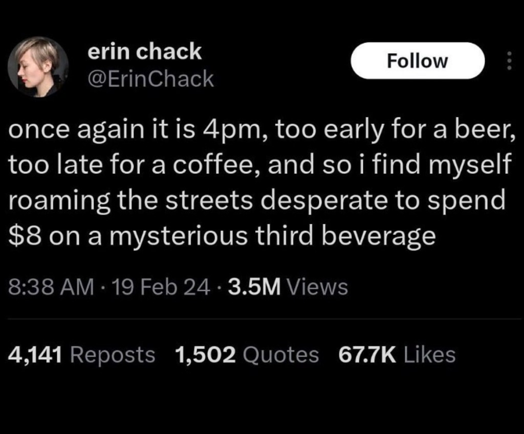 7.51/366: mysterious third beverage Kerry Faler Uncategorized February 19, 2024 1 Minute Current situation: it is 3:08. Thank the Lord it’d not any later. Share this: Click to share on X (Opens in new window) X Click to share on Facebook (Opens in new window) Facebook Like Loading... Published by Kerry Faler I collect typewriters in the 21st century. I’m an enigma that way. View all posts by Kerry Faler Published February 19, 2024
