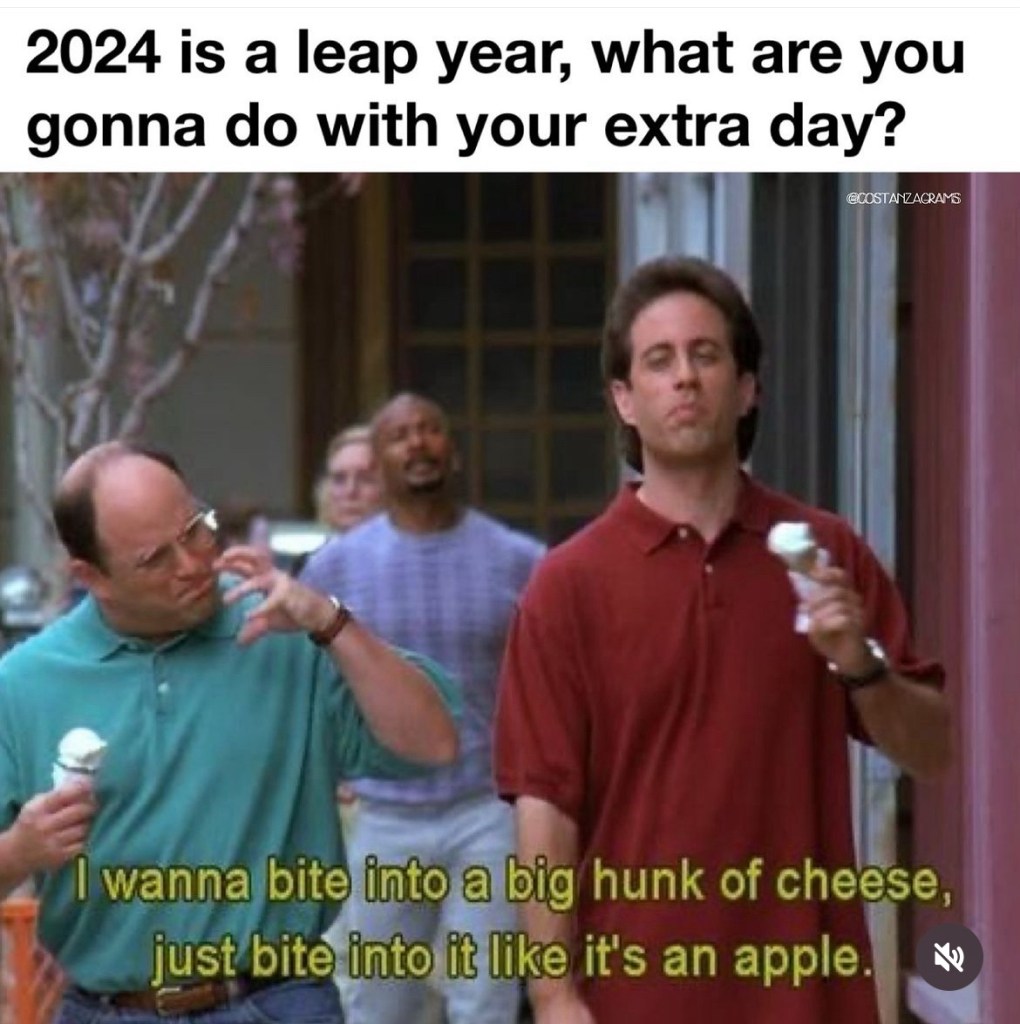 7.58/366: leap year plans Kerry Faler Uncategorized February 28, 2024 1 Minute No, this is a plan I can get down with. Share this: Click to share on X (Opens in new window) X Click to share on Facebook (Opens in new window) Facebook Like Loading... Published by Kerry Faler I collect typewriters in the 21st century. I’m an enigma that way. View all posts by Kerry Faler Published February 28, 2024