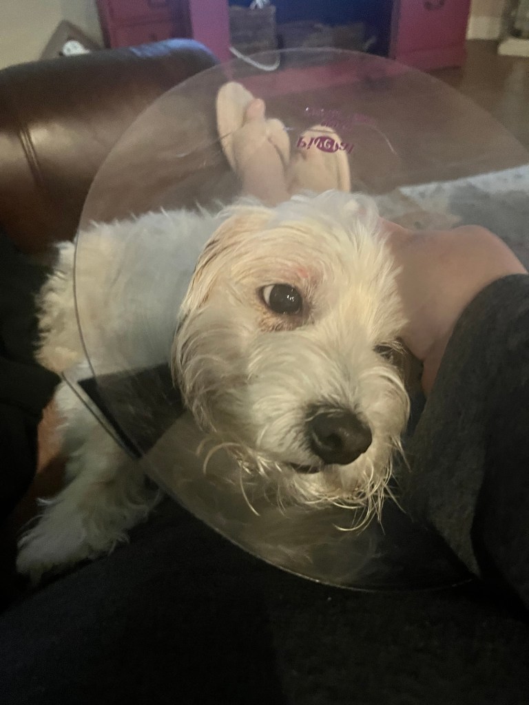 My doggie, Ellie (Eleanor Rugby), started scratching at her eyes last week, so I called the vet and they told me to use a salve like Neosporin, but not that and to get a cone fit her head. I got donut for her. The donut didn’t stop her from scratching, so we went to the vet this morning.
