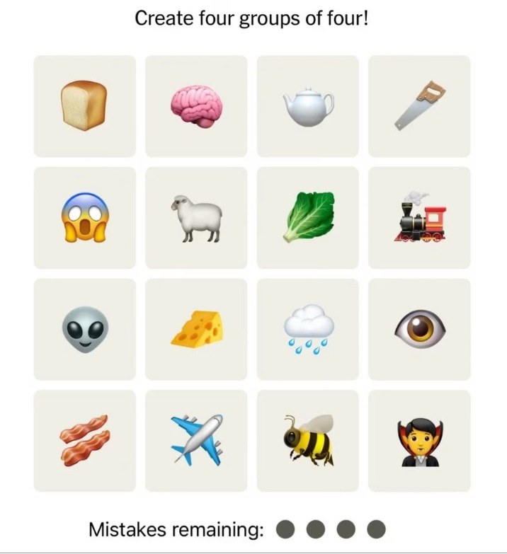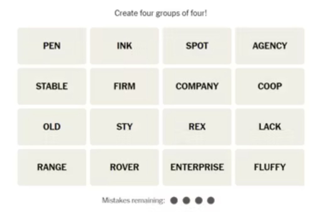 I play all of the New York Times games every morning. Connections is new-ish and is my favorite. It’s a 4×4 puzzle of words, making up four groups of four words that have a theme.