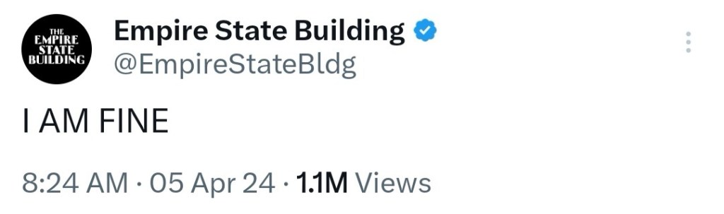7.96/366: earthquake Kerry Faler Uncategorized April 5, 2024 1 Minute Thank goodness. Share this: Click to share on X (Opens in new window) X Click to share on Facebook (Opens in new window) Facebook Like Loading... Published by Kerry Faler I collect typewriters in the 21st century. I’m an enigma that way. View all posts by Kerry Faler Published April 5, 2024