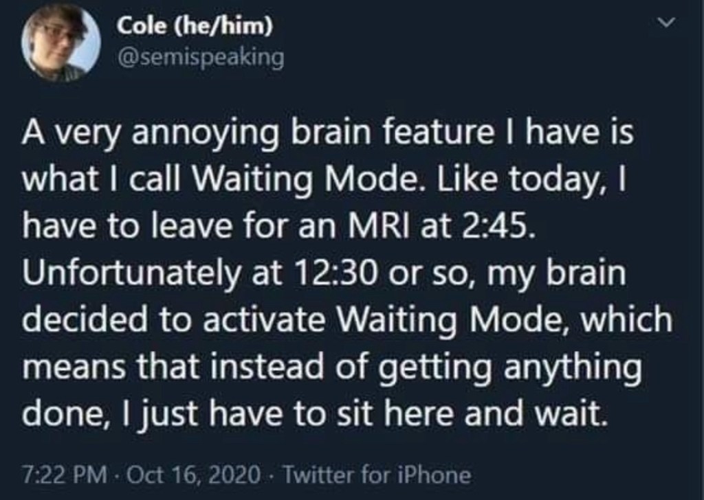 Y’all, I tried explaining this to so many people. ADHD makes me unable to do virtually anything until the time of an appointment or something I’ve planned. It does not make sense AT ALL, and intellectually, I know this; but my brain says “hey, you have to be in The Woodlands at 2:30, slow your roll.”