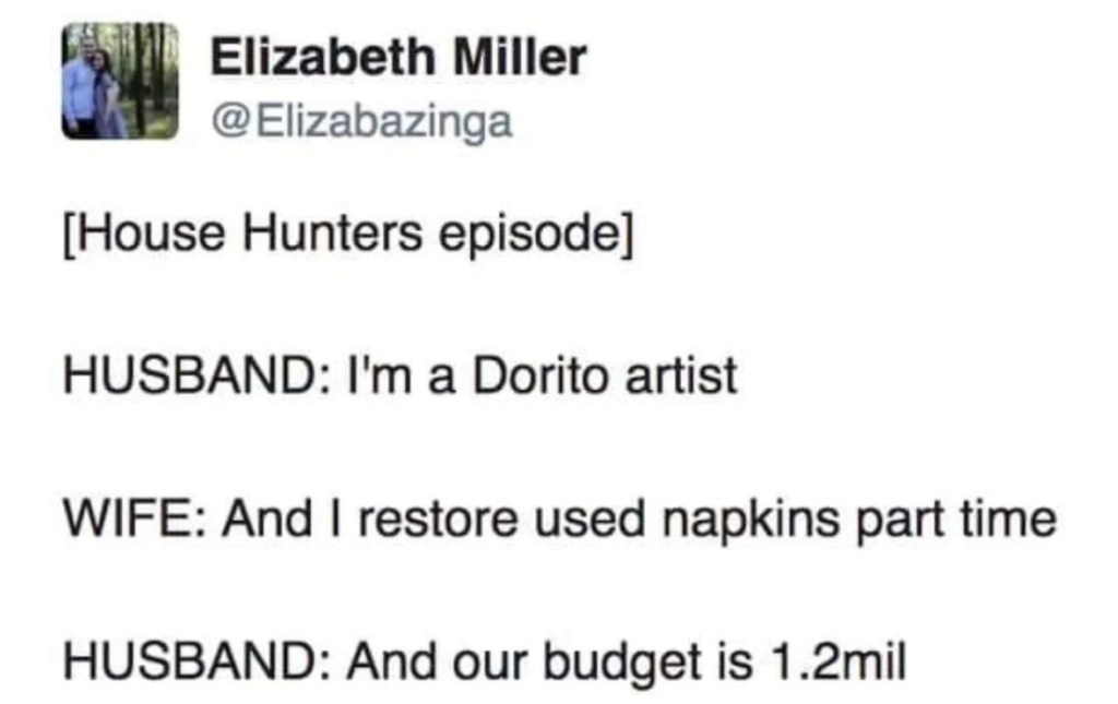 I’ve been a huge fan of House Hunters from the beginning. I am never ready for the occupations of the couples. I’ve been making jokes about if for years. The one below is perfect.