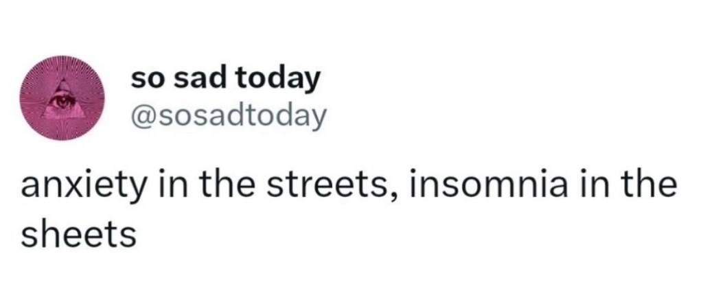 7.236/366: insomnia stuff Kerry Faler Uncategorized August 23, 2024 1 Minute I identify with this. Share this: Click to share on X (Opens in new window) X Click to share on Facebook (Opens in new window) Facebook Like Loading... Published by Kerry Faler I collect typewriters in the 21st century. I’m an enigma that way. View all posts by Kerry Faler Published August 23, 2024