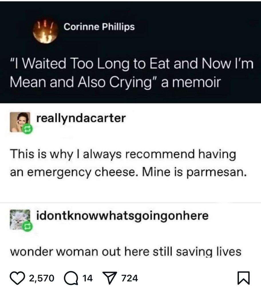 7.263/366: emergency cheese Kerry Faler Uncategorized September 21, 2024 1 Minute Wonder Woman out here on the interwebs saving lives! My emergency cheese is usually mozzarella. Share this: Click to share on X (Opens in new window) X Click to share on Facebook (Opens in new window) Facebook Like Loading... Published by Kerry Faler I collect typewriters in the 21st century. I’m an enigma that way. View all posts by Kerry Faler Published September 21, 2024