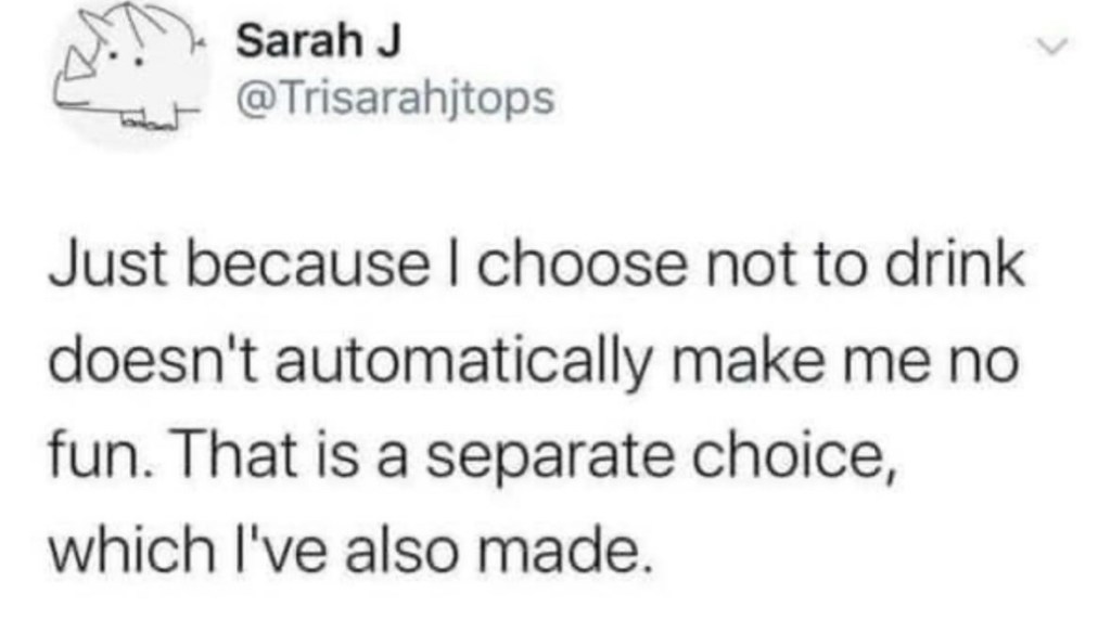 I have a drink twice, maybe three times a year. A Cinco de Mayo margarita and sometimes a Mother’s Day mimosa. I do love an eggnog daiquiri at Christmas, but I haven’t had one in several years. I’ve never liked the taste of alcohol and I have a major aversion to drunk people. So, I choose not to drink. I also choose whether or not I’m fun.
