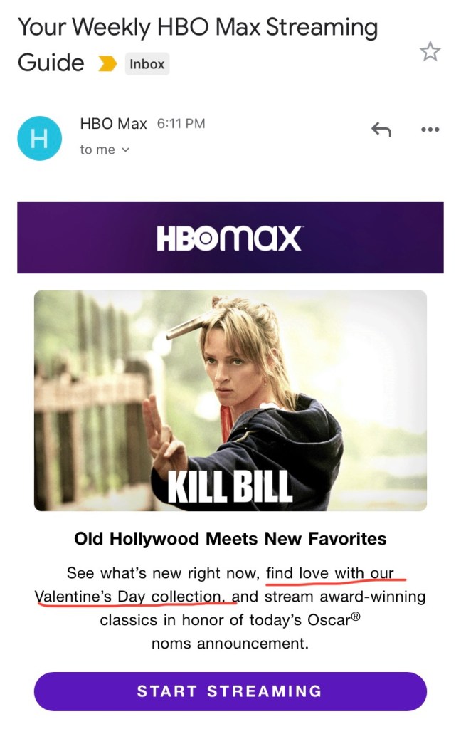 Not the film I’d go within an email about your Valentine’s Collection collection, HBO Max.