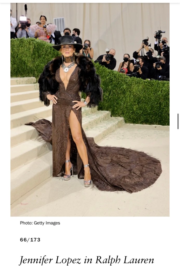 Do I hate it, no. I’m not a J-Lo fan. She’s not a terrible singer or a terrible actor — I’m just not a fan. It’s that she has done the extreme plunge neckline 100 times with the extreme leg slit. If she would have worn that dress, but as a jumpsuit and added chaps — holy shit — that would have been a lewk. This is confusing. It’s an Oscar gown and her stylist added a bearskin half-jacket and a Clint Eastwood style hat. She was on the way to the Gala, met Clint Eastwood on the way, who had just killed and skinned a bear, and asked him to borrow them because she forgot she needed to look vaguely American-ish.
