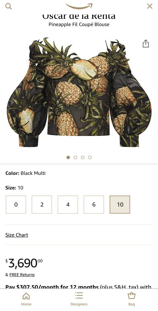 An Oscar de la Renta pineapple blouse that goes up to a size 10 and costs 3690 American dollars OR $390 a month. LIKE A CAR. You’re not even ready to hear that the matching skirt is $3900.