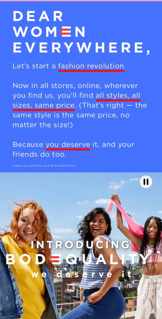 I’m just thrilled today. Today marks the day Old Navy started selling women’s inclusive sizes, 0-30, in stores and online in all styles. Since Old Navy started selling plus sizes, they were hit and miss — the styles never were the same as the “regular” sizes. Now with “Bod Equality,” all styles are available in all sizes. I have great hopes for this. Not just because of Old Navy, but because it sets a precedent for other stores. It’s about time. Did I mention all sizes cost the same? Yeah. Unless you’re a plus-sized woman, you probably didn’t know we’ve been paying more for our clothes all these years. For a few inches of fabric.
