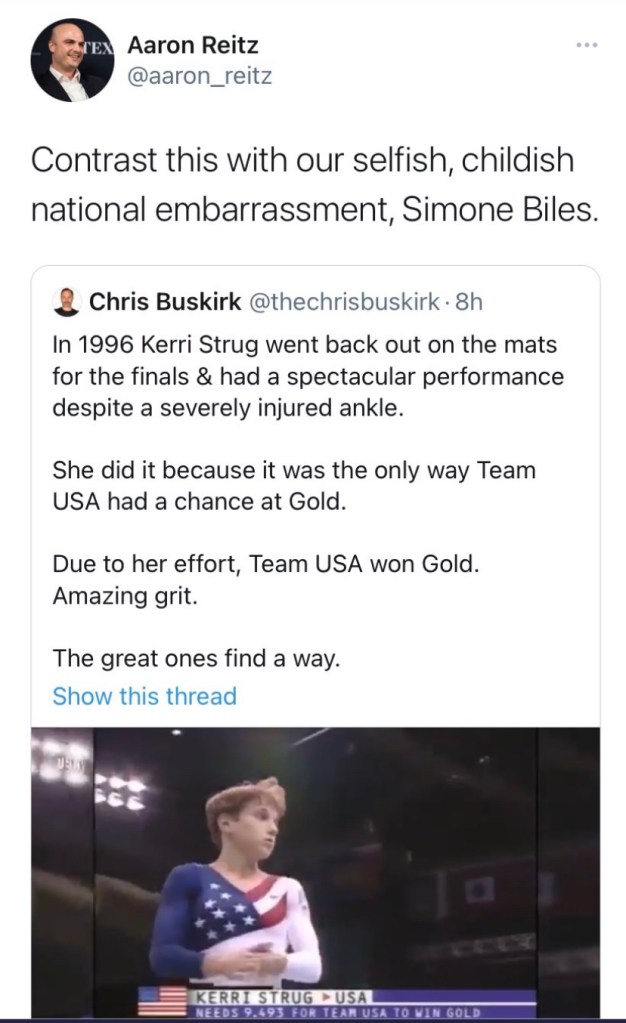 We love to tear down our beloved stars, politicians, athletes, and heroes, don’t we? Aaron Reitz is a disgrace to his office, state, and country. Simone Biles is a Texan. Maybe she didn’t see that tweet and won’t hear of it, but there are so many like that. Mostly men. Biles competed at Nationals with broken toes in each foot and in the World competition with a kidney stone while the likes of Reitz and Piers Morgan probably tweeted from their toilets.