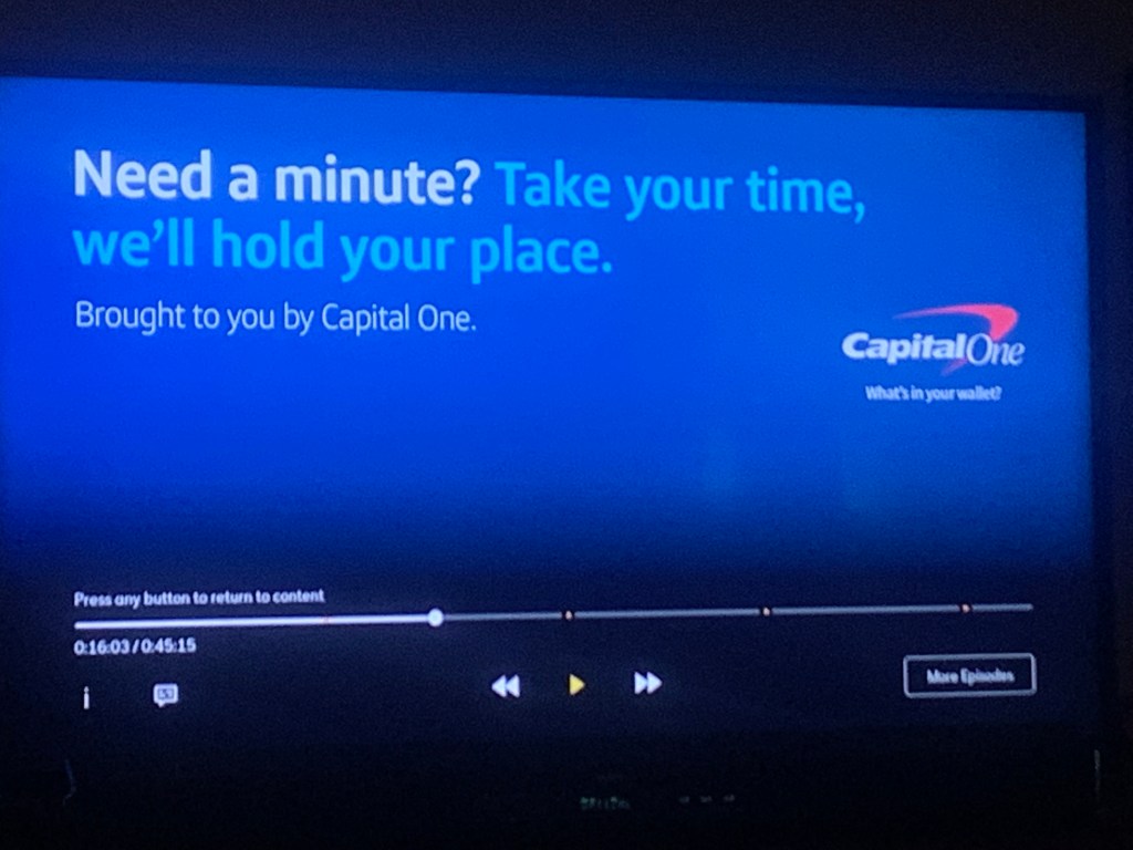 Yeah, that’s how pause works, Capital One. I hit pause and the magic streaming cable box knows to pause the show. You’re not helping me — the tv would do this without you. This is an ad. No one is dumb enough to think you are holding their place while they go to the bathroom. Ugh. The stupidity.