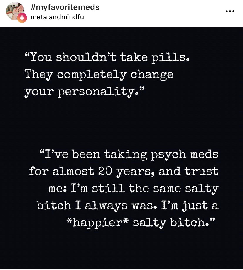 My Favorite Meds is one of my favorite Instagrammers. This one is great because I’ve heard so many people over the years say thru don’t want to take psychiatric meds for their whatever disorder because it will change their personality. Um, that’s not how they work. I know, I’ve been on them for 15 years.
