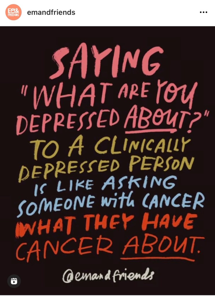 Depression is not caused by one thing. It doesn’t go away when you come into money or you move away from your hometown or get out of a bad relationship.