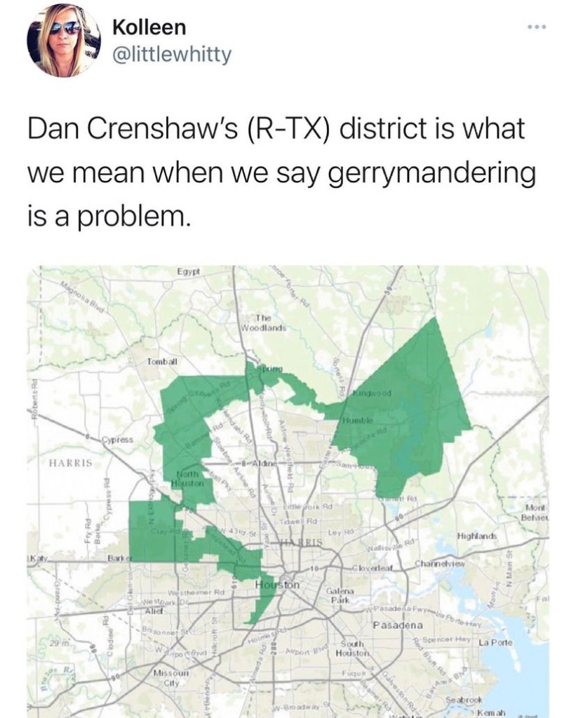 This is the greater Houston area. The green area is Dan Crenshaw’s district. I live in big mostly white suburb in the absurdly mostly white big green section on the right in the map.