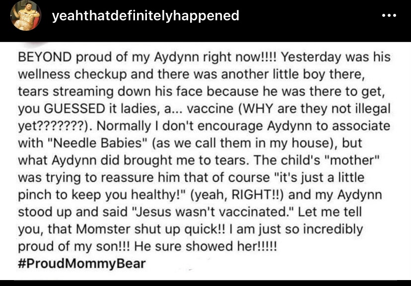 So many atrocities. Naming your child Aydynn should signal CPS automatically. Seeing the name made me know it would be an anti-vaxxer. The mom doesn’t “encourage Aydynn to associate” — that’s exactly how I described my kids’ interactions with little kids years ago, you know, like a business meeting. “Needle babies.” yeah, that’s not a thing anyone says.