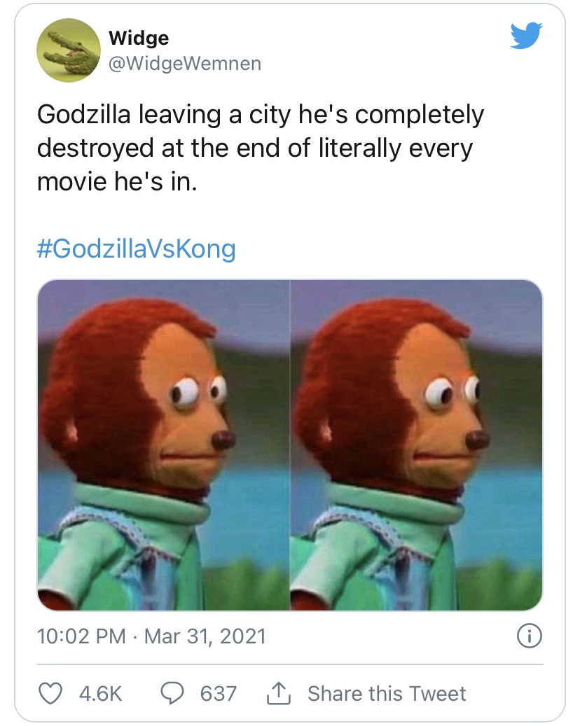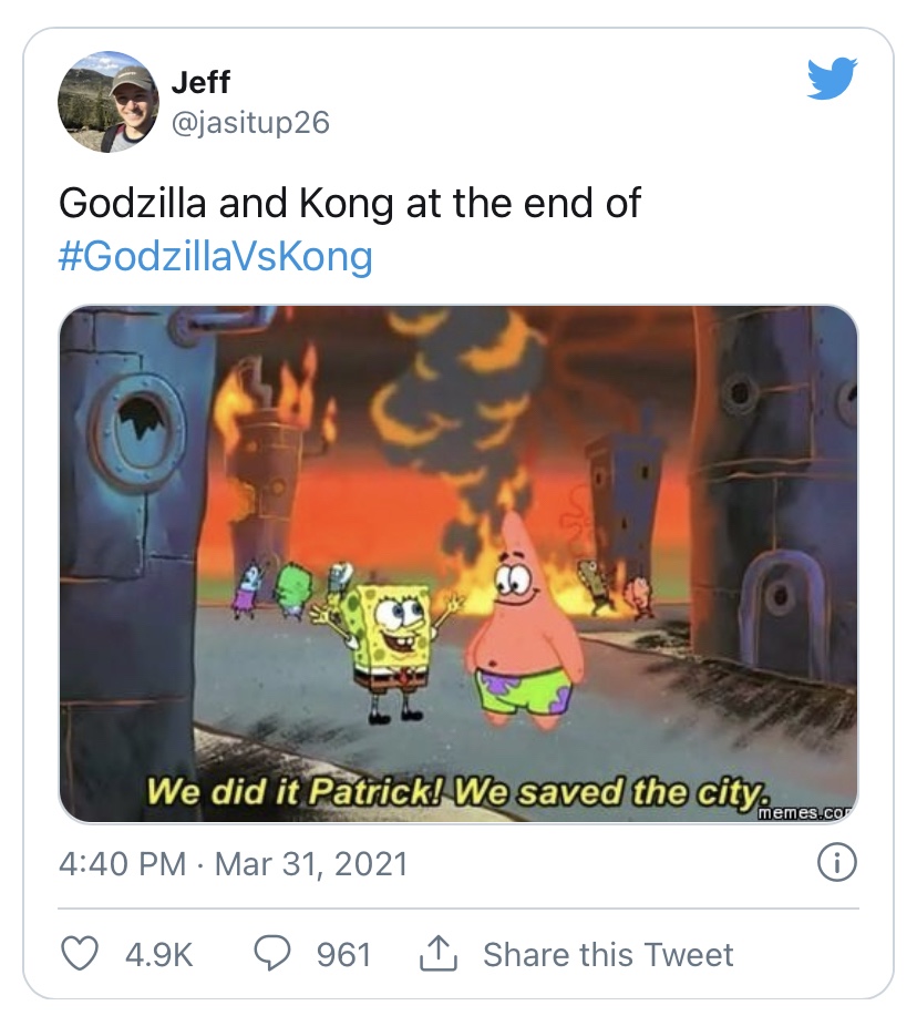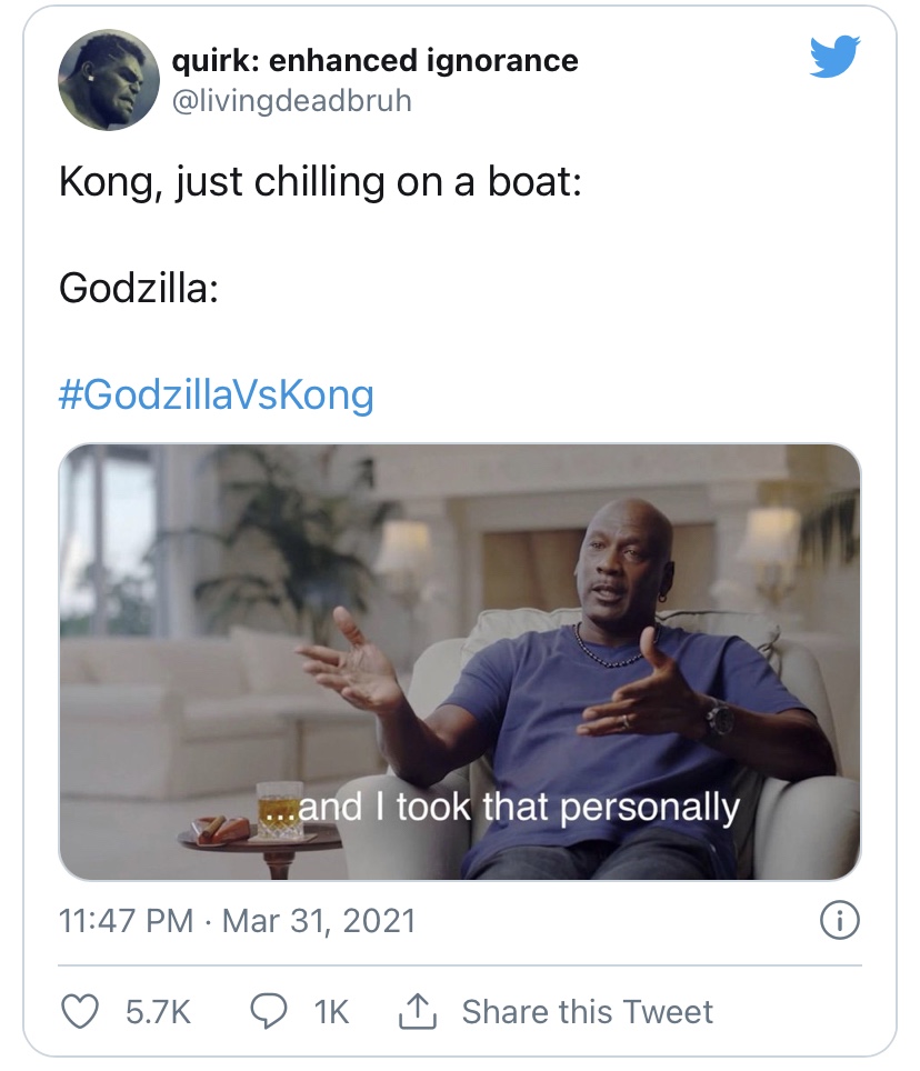 Instead of giving you my review of Godzilla vs Kong, I’m letting Twitter do it for me. You’re welcome.