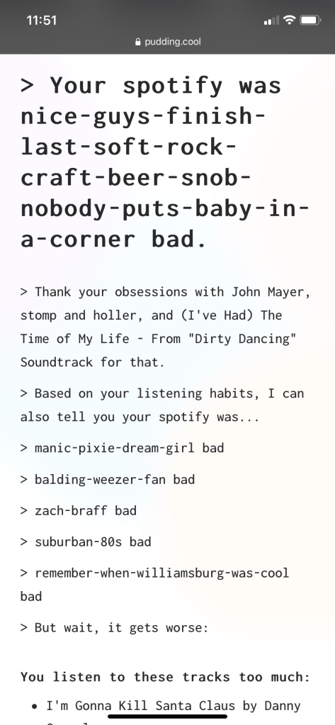 My daughter sent me this AI that analyzes your Spotify listening for the past year. It is quite fun. Here is part of mine:
