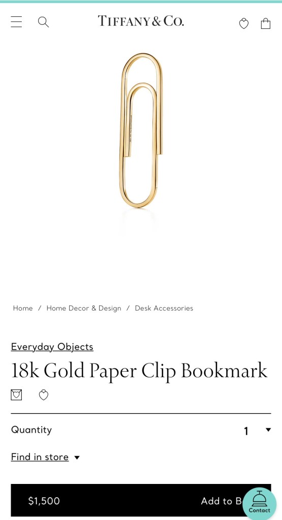 But a tin can doesn’t really scream ”I’m so wealthy!” What if you need a gift for your secretary? Tiffany has you covered with a $1500 18 K gold paperclip. Of course, she will need more than one.