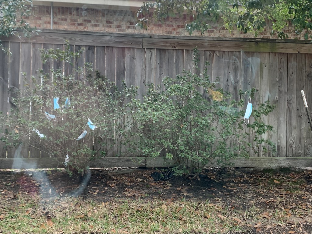 The neighborhood kids have been hanging their masks on this bush (which I’m calling the Hanukkovid bush) as they walk home from the bus stop.