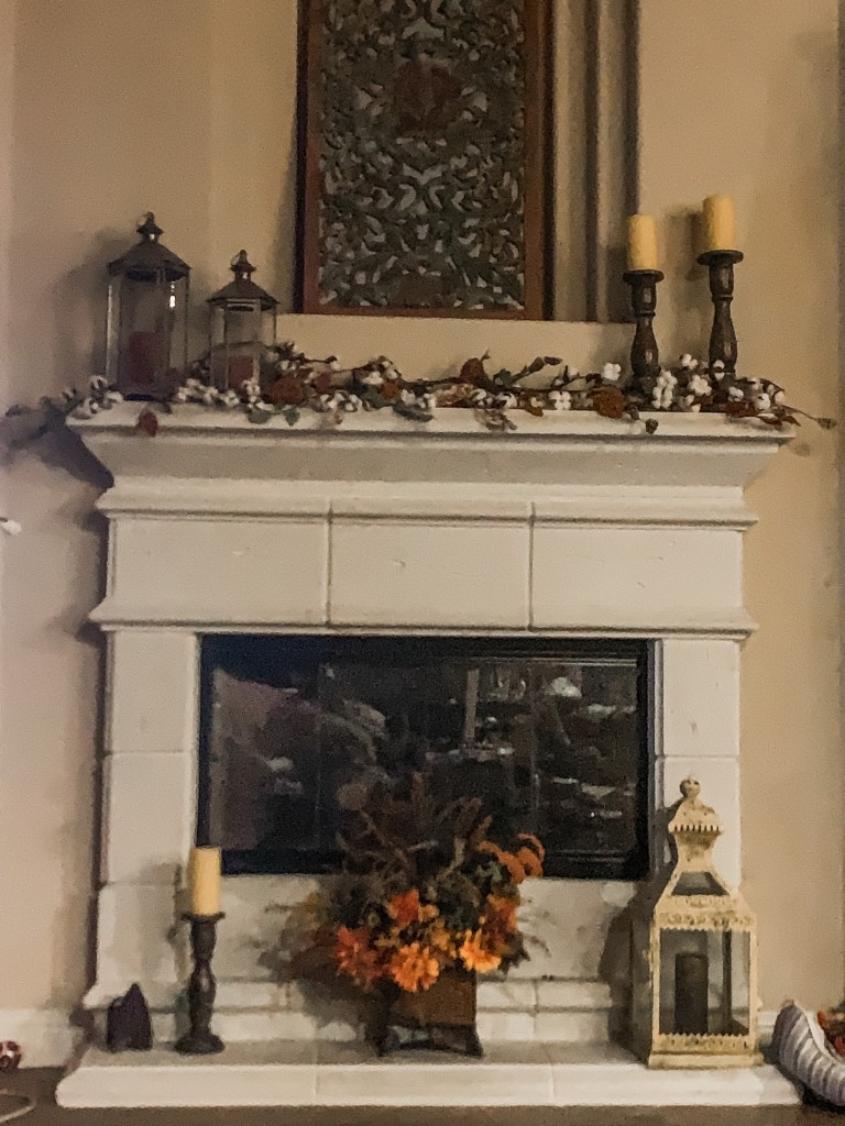 I want it to be autumn, so I decorated my mantel. It’s one of my favorite things. Cotton, fabric leaves, and small orange flower bunches. I like lanterns, can you tell? My great-grandmother’s lanterns are on her Hoosier cabinet in another part of the room. And that’s her iron next to the candlestick. Mixing it up. Waiting for fall.