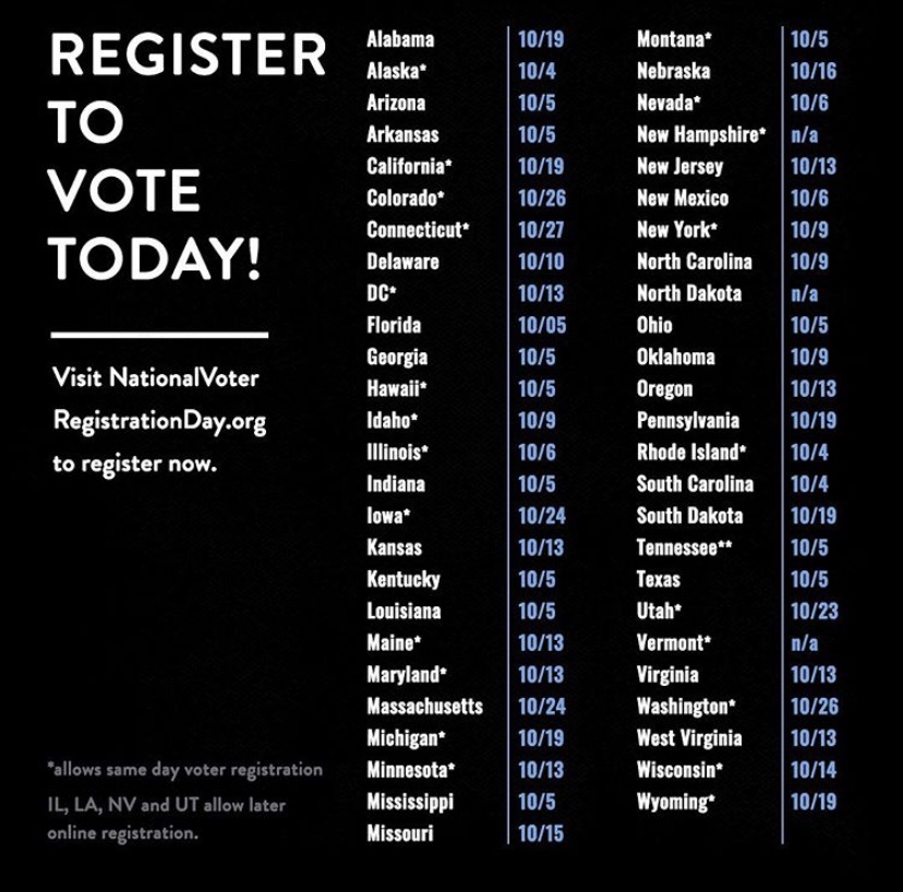 Today is National Voter Registration Day! Visit the URL beow to find out about voting in your state. The last date to register before the November 3rd election in your state is also below.