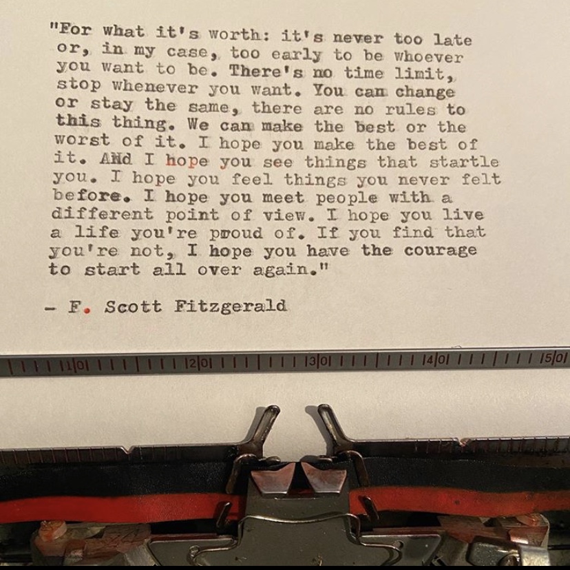 So, I thought this demanded research, as I cannot leave anything alone. After a few minutes of good old fashioned Googling, I found out it was from the film, The Curious Case of Benjamin Button, which is based on Fitzgerald’s short story of the same name. But the quote isn’t in the text. Curious, indeed. I surmise the rather lovely quote to be that of the film’s screenwriter, Eric Roth (it most certainly was not Brad Pitt).